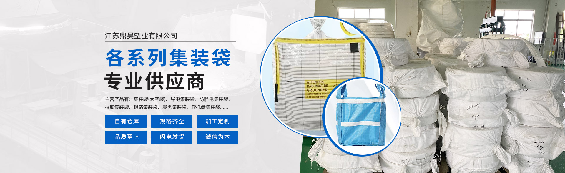 主要产品:集装袋(太空袋)、导电集装袋、防静电集装袋、拉筋集装袋、铝箔集装袋、炭黑集装袋、软托盘集装袋、透气网纱袋、小型半吨集装袋、编织袋、纸塑复合袋等,产品广泛用于矿石、塑料、化工、新能源、食品、医药等行业。